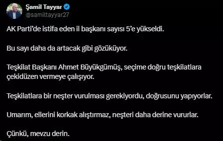 AK Parti’de peş peşe istifalar yaşanırken eski AK Parti Milletvekili Şamil Tayyar’dan dikkat çeken bir kıymetlendirme geldi. Tayyar, istifalar üzerine toplumsal medyadan yaptığı paylaşımda sürecin devam edeceğine işaret ederek şu tabirleri kullandı: