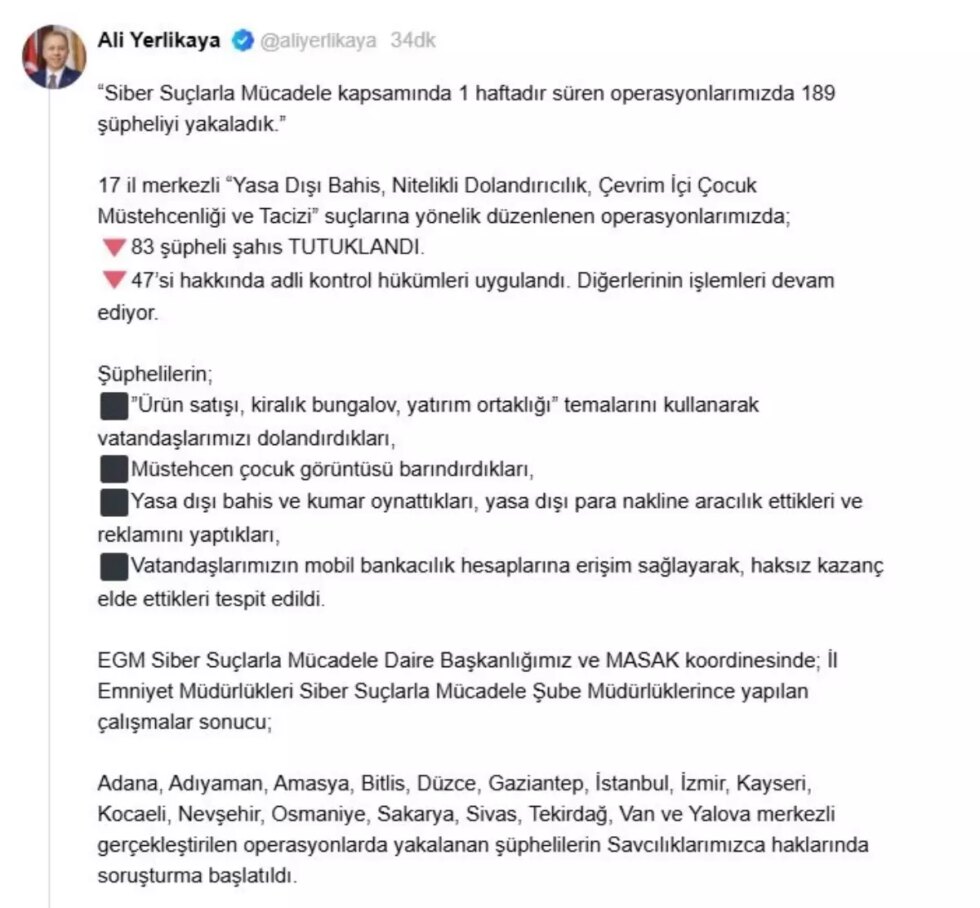 İÇİŞLERİ Bakanı Ali Yerlikaya, 17 vilayette siber kabahatlere yönelik düzenlenen operasyonda 189 şüphelinin yakalandığını, 83’ünün tutuklandığını açıkladı.