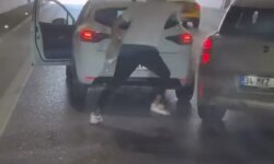 İki şoför ortasında yol verme nedeniyle başlayan tartışma, arbedeye dönüştü. O anlar kamerada.