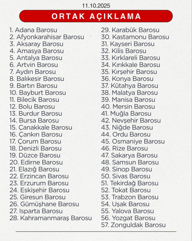 Adıyaman, Ağrı, Ankara, Ardahan, Batman, Bingöl, Bitlis, Diyarbakır, Gaziantep, Hakkâri, Hatay, Iğdır, İstanbul, İzmir, Karaman, Kars, Kocaeli, Mardin, Muş, Şanlıurfa, Siirt, Şırnak, Tunceli ve Van baroları bildiriyi imzalamadı.