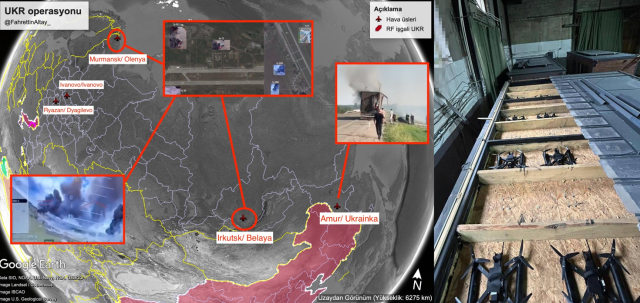 Ukrayna, gizlice Rus topraklarına soktuğu İHA’ları kamyonlara saklamış, Murmansk, Irkutsk, Ivanovo, Ryazan ve Amur bölgelerindeki hava üslerine atak düzenlemişti. Taarruzda çok sayıda Rus bombardıman uçağı vurulmuştu.